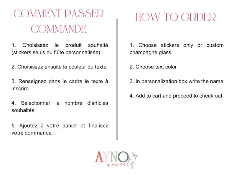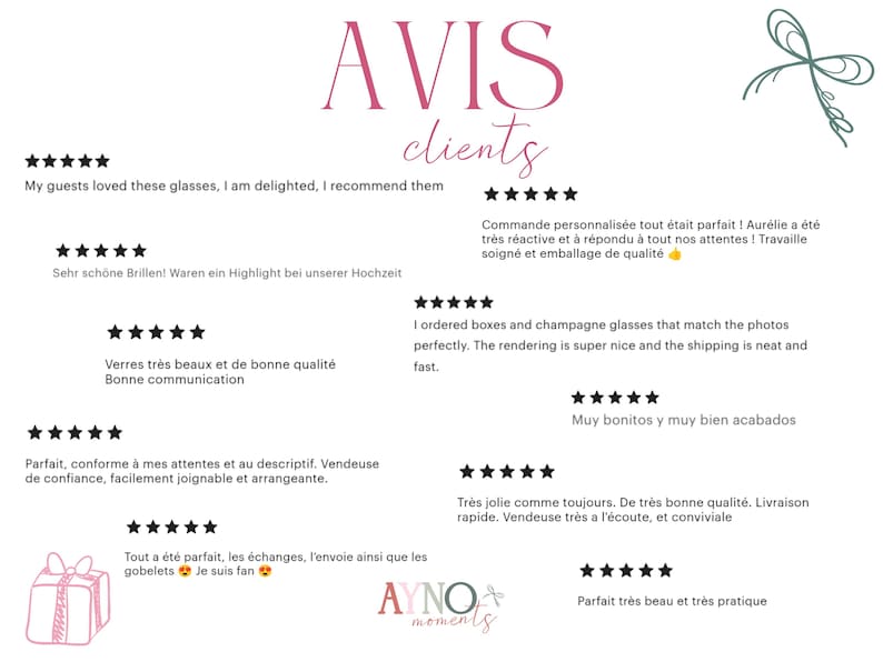 Haz que tus celebraciones sean un más especiales con esta copa de campeón personalizada con nombre. Ideal como regalo de bodas, para la propuesta de matrimonio del padrino o para el futuro novio, añade un toque elegante y nico a tus brindis. Caractersticas- Copa de campeón de 18 cl- Personalización con nombre, rol o mensaje (futuro novio, testigo, dama de honor, etc.)- Adhesivo de calidad disponible en varios colores.- Perfecto para bodas, despedidas de soltera o brunchs de boda. - No apto para lavavajillas.- No apto para microondas- Lavar a mano nicamente- No remojarAynoMoments no ser responsable de flautas daadas debido a un uso inadecuado. 1. Elige el producto deseado (solo stickers o flauta personalizada)2. Luego elige el color del texto.3. Introduzca el texto que desee introducir en el cuadro4. Seleccione el número deseado de elementos5. Aade a tu carrito y completa tu pedido. El tiempo de entrega depende del transportista, por ejemplo para La Poste el tiempo medio de entrega es de 48 horas. Si su pedido es urgente, agrega el artículo "pedido prioritario" para que pueda procesarse y enviarse en 48 horas. general de la preparacin de tu pedido y tambin cdigos promocionales!