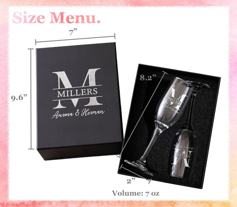 Haz que tu da especial sea un más memorable con nuestras copas de champán personalizadas para bodas. Ya sea que celebres tu boda, despedida de soltera, aniversario o cualquier otra ocasión especial, estas copas son la manera perfecta de brindar por tu amor y compromiso. Elaboradas con cristal de primera calidad, nuestras copas de champán personalizadas para boda presentan un diseño clásico y atemporal, perfecto para cualquier temática de boda. Cada copa se puede personalizar con el texto que prefieras, ya sean tus iniciales, la fecha de la boda o un mensaje especial. Con una forma alta y esbelta, estas copas mantienen vivas las burbujas por más tiempo, realzando su experiencia con campeón o vino espumoso. Son un hermoso recuerdo de su día especial y pueden usarse para futuras celebraciones y eventos importantes. Tambin son un regalo maravilloso para los recién casados, la despedida de soltera o familiares y amigos cercanos.Dimetro 2" x Altura 8,2"Volumen 7 oz. (220 ml)Características del productoDiseo personalizable cada vaso se puede personalizar con tu texto preferido, lo que los hace verdaderamente nicos.Construcción de alta calidad fabricados con vidrio de primera calidad, estas flautas son duraderas y elegantes.Diseo atemporal con una forma alta y delgada, estas copas mantienen las burbujas vivas por más tiempo, mejorando su experiencia con champán o vino espumoso.Gran idea para regalo estas copas son un maravilloso recuerdo para recordar su da especial y pueden usarse para futuras celebraciones y acontecimientos importantes.Acerca del envoNACIONAL (EE. UU.) 3 a 5 das hbilesINTERNACIONAL 7 - 14 das hbilesPor lo tanto, generalmente toma entre 4 y 7 das hbiles (PROCESAMIENTO + ENVO) después de la fecha del pedido para recibir su pedido.Tenga en cuenta la fecha de "envo" en su factura NO es equivalente a la fecha de "entrega" real.- FECHA DE ENVO Cuando su paquete sale de nuestro estudio.- FECHA DE ENTREGA Cuando te llegue tu paquete. Nota para envos internacionales- Por favor, deje nombre completo y número de contacto.- El cliente es responsable de todos los aranceles e impuestos. Las políticas aduaneras varan considerablemente segn el pas, y algunos pases no cobran tasas de importación por envos que no alcanzan un valor mínimo. Puede contactar con la oficina de aduanas del paso de destino para obtener más información.Para los productos con un valor que supere este límite, se aplicarán impuestos de importación, tarifas y derechos de aduana (en adelante, "Tarifas de importación"), cobrados por la oficina de aduanas de su destino de envo, que podrán rondar entre el 10 y el 25 % en total, dependiendo de las regulaciones de la autoridad local. Como todos nuestros productos son personalizados, no emitiremos reembolsos por productos devueltos al remitente debido a tarifas aduaneras no pagadas.--------------------------------------------------------------Copas de champn personalizadas, copas de champn para bodas, copas de brindis grabadas y personalizadas, copas de champn para novios, copas de champn para seor y seora, copas de brindis personalizadas, regalos de boda, copas de brindis, copas de champn, copas de champn personalizadas para novios