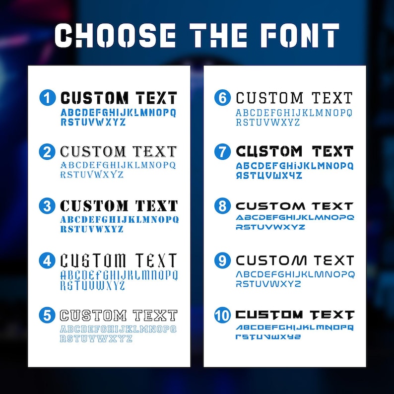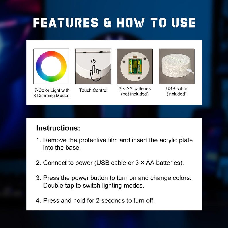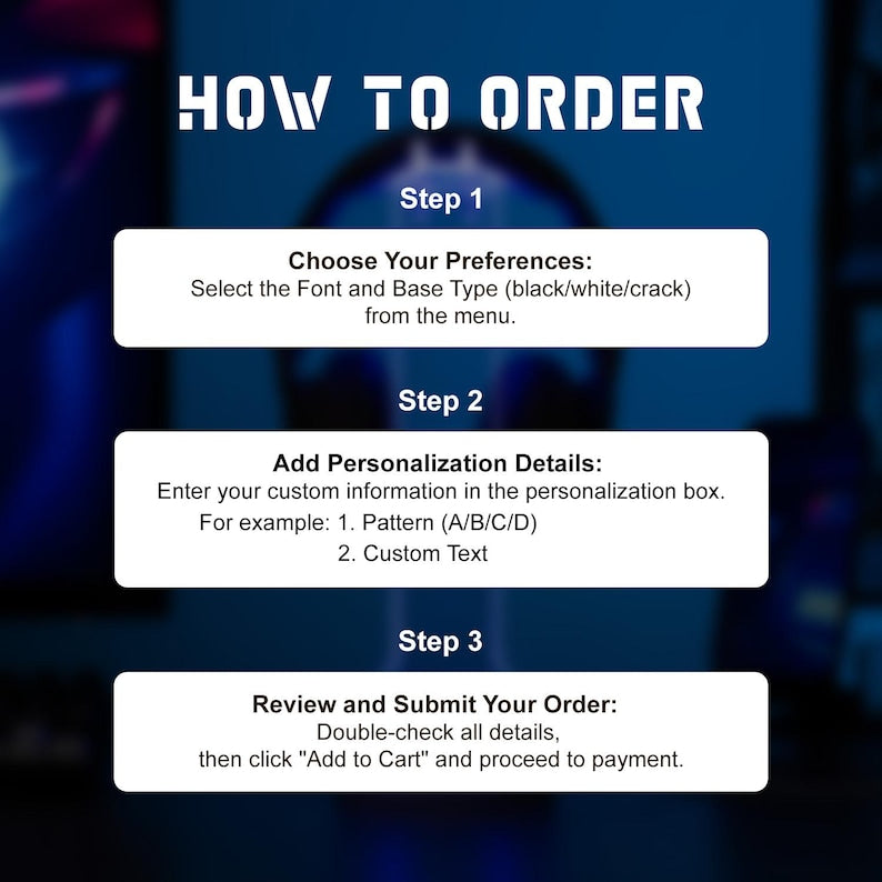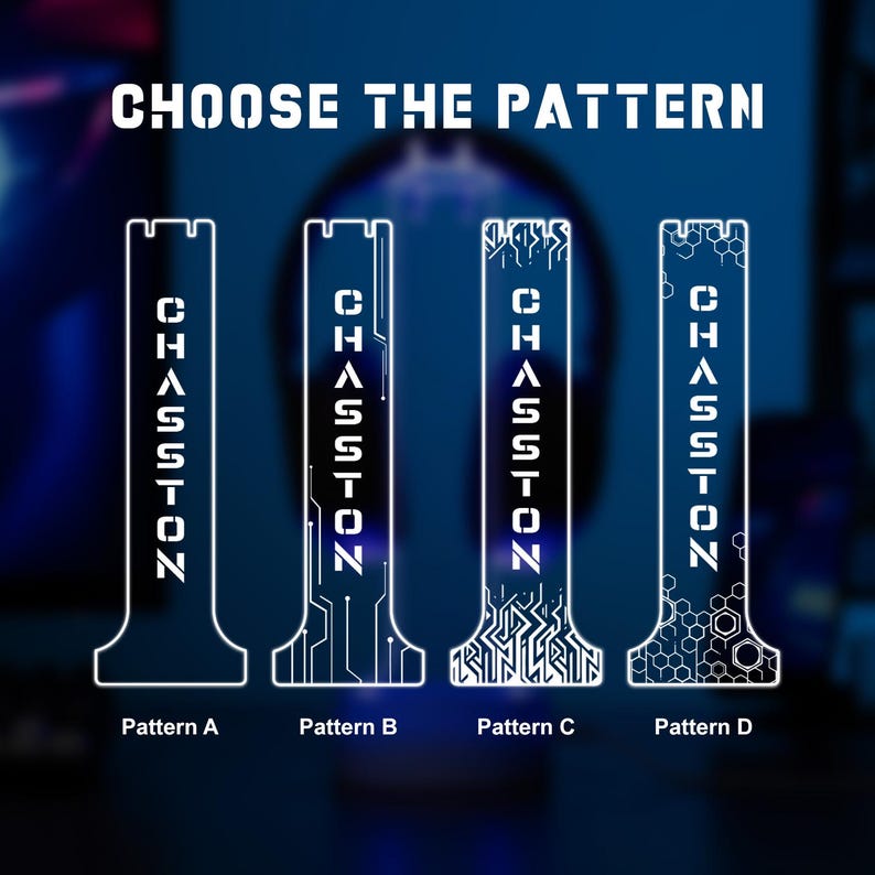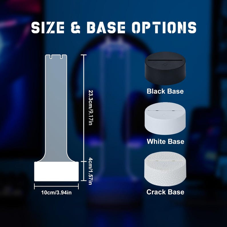 Soporte RGB personalizado para auriculares regalo para gamers | Pantalla LED personalizada con nombre o logotipoMejora tu equipo de gaming con nuestro elegante soporte para auriculares RGB la combinación perfecta de estilo y funcionalidad. Este soporte iluminado no solo organiza tus auriculares, sino que también añade un brillo vibrante que realza tu ambiente de juego. Mantén tu escritorio ordenado mientras exhibes tu equipo con esta exclusiva pantalla LED personalizada. Con 10 diseños exclusivos para elegir (o sube tu propio logotipo), este soporte es una verdadera joya para cualquier sala de juegos o estación de trabajo. ¿Un regalo considerado para los jugadoresBuscas el regalo perfecto para un gamer? Ya sea para Navidad, un cumpleaños o simplemente porque s, este soporte para auriculares RGB personalizado es una sorpresa divertida y práctica que realmente usar. Qu incluye*Base LED RGB con 7 opciones de color y 3 modos de iluminación*Placa acrílica personalizada elija entre 18 diseños o carga su propio logotiponombre*Cable USB compatible con cargadores, computadoras de escritorio, porttiles y bancos de energía. Modo de empleoPresione el botón de encendido para encender y cambiar colores (7 en total rojo, verde, azul, amarillo, cian, morado, blanco + ciclo de colores). Toque dos veces para cambiar los modos de iluminación. Mantenga presionado durante 2 segundos para apagar. Instrucciones de limpieza Limpie suavemente el panel acrílico con un paño limpio y suave. Evite utilizar limpiadores abrasivos para evitar dañar la superficie. Notas de seguridad1. Retire las baterías recargables antes de cargarlas.2. No mezcle diferentes tipos de baterías (estndar vs. recargables) o baterías viejas y nuevas.3. Inserte las pilas respetando la polaridad correcta. Cómo hacer un pedido1 Elige tus preferencias Selecciona la fuente y el tipo de soporte en el men.2 Agregar detalles de personalización Ingrese su información personalizada en el cuadro de Personalización1) Patrón ABCD2) Texto o nombre personalizado3 Revise y enve su pedido Verifique todos los detalles, luego haga clic en "Agregar al carrito" y proceda al pago.